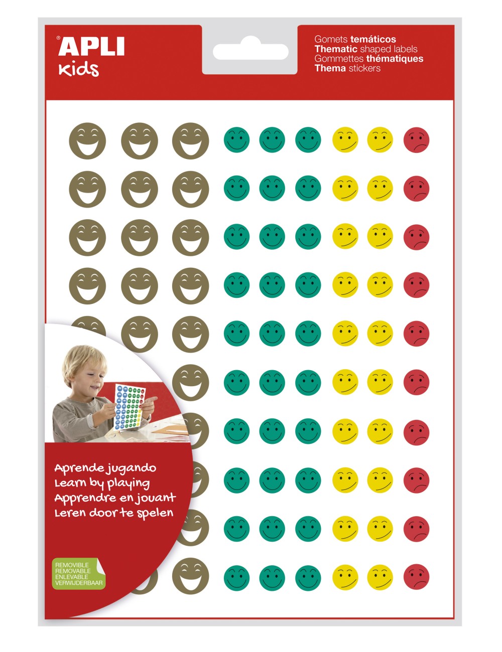 Sachet de gommettes Sourire mini avec adhésif repositionnable. Chaque sachet contient 12 feuilles, un total de 1 080 gommettes par sachet. Chaque sachet contient 4 styles différents de gommettes: gommettes dorées (Ø 15 mm - 360 gommettes), gommettes vertes (Ø 10 mm - 360 gommettes), gommettes jaunes (Ø 10 mm - 240 gommettes) et gommettes rouges (Ø 10 mm - 120 gommettes). Les gommettes Sourire motivent et récompensent les efforts et réussites des enfants. Vous pouvez ainsi créer un cadre d’encouragement dans lequel vous collerez une gommette à chaque fois que l’enfant réussit quelque chose. Les différents visages encouragent également les enfants à décrire leurs sentiments et leur état d’esprit. De plus, les gommettes APLI respectent les normes les plus strictes de qualité et de sécurité. Fabriquées dans le respect des normes EN-71: Adhésif à base d’eau, Sans solvants, Papiers ECF (Elemental Chlorine Free), papier frontal 100% recyclable.