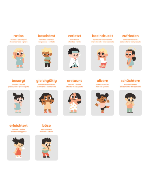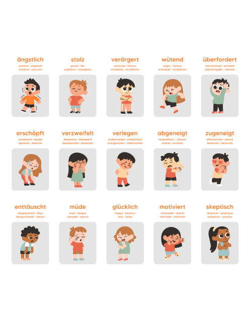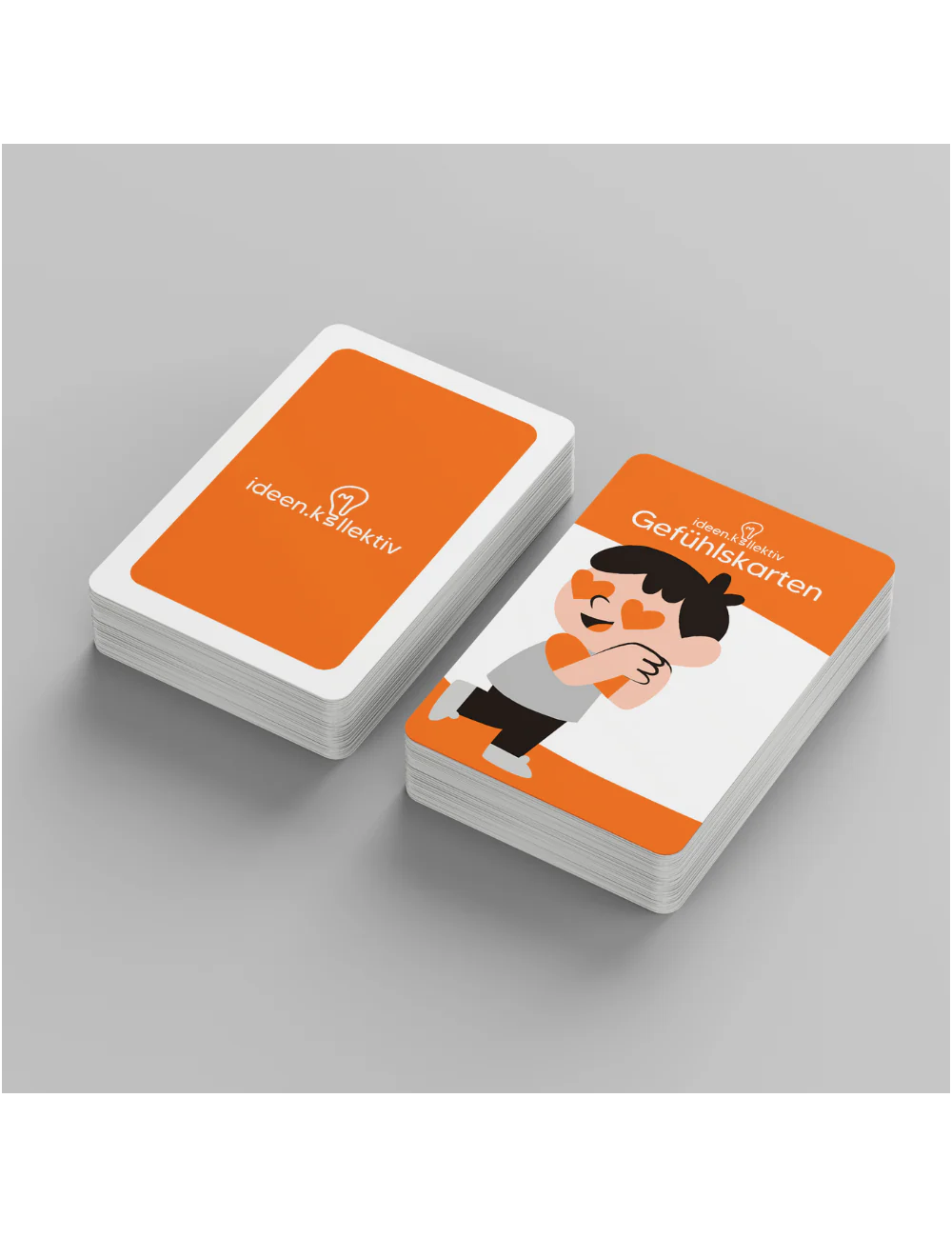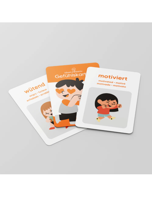 Les Cartes des émotions d'ideen.kollektiv sont un outil polyvalent pour le coaching, la thérapie et la réflexion personnelle. Chaque carte présente une illustration émotionnelle d'une personne, accompagnée du mot correspondant à l'émotion. Les mots sont affichés en allemand, anglais, français, espagnol et italien. Elles permettent de rendre visibles des émotions complexes, facilitent la communication autour des ressentis et offrent de nouvelles pistes pour les processus thérapeutiques ou de conseil. Les cartes peuvent être utilisées individuellement ou en combinaison avec les figurines Systembrett Pro dotées d'une fente pour carte. Le set contient également des cartes symboliques, pouvant être exploitées pour un travail créatif et systémique supplémentaire.