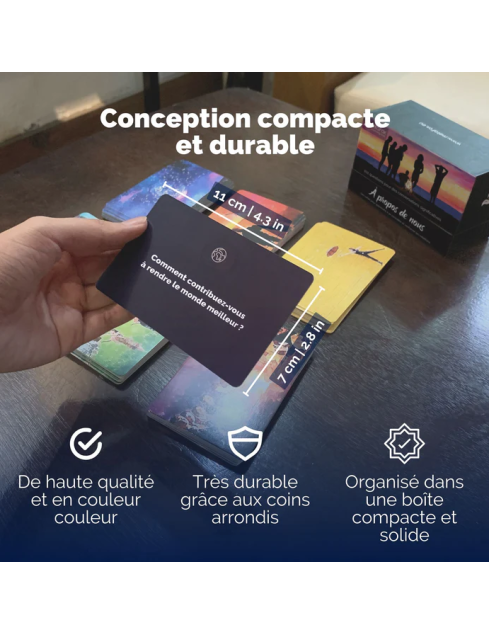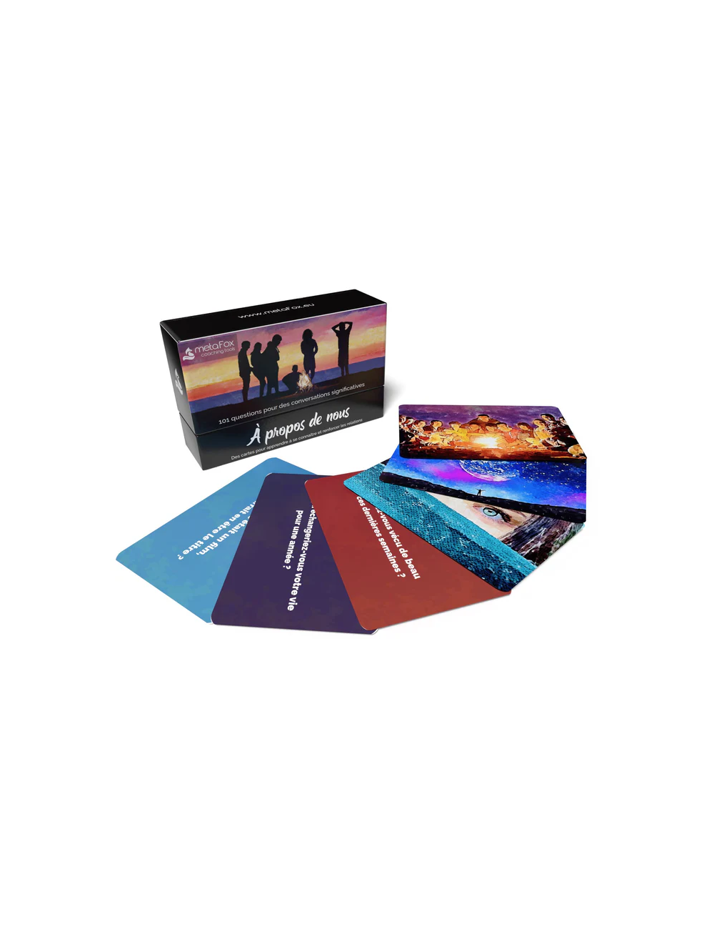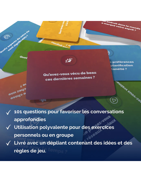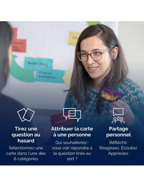 Cartes de questions pour le Team Building conçues pour se rapprocher de son équipe ou de ses (nouveaux) amis. Idéal pour créer du réseau, apprendre à connaître les autres, team building, activités de groupe, interaction de groupe, développement personnel, coaching, formation et ateliers. Aussi disponible en allemand. |