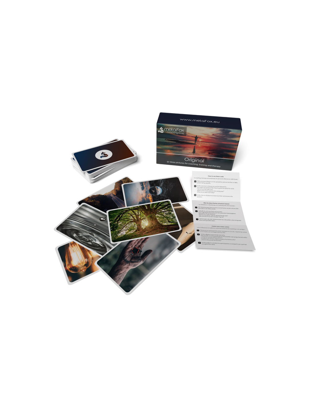 Die metaFox deep pictures vereinen beides in einem Kartenset. Vordergründig ein Bild, auf der Rückseite jeder Karte eine passende, kraftvolle Coaching Frage für Erwachsene.