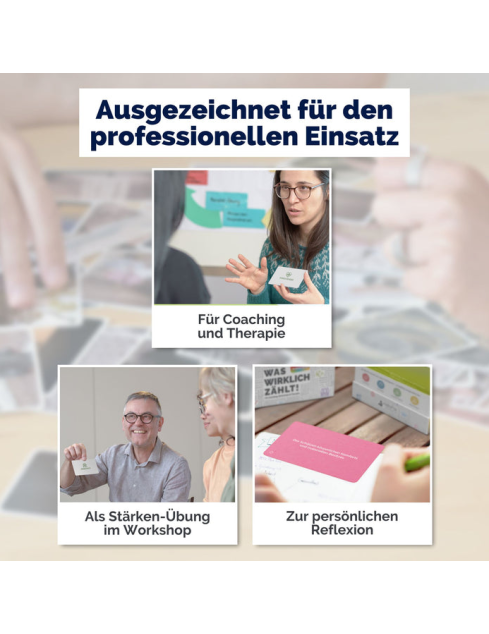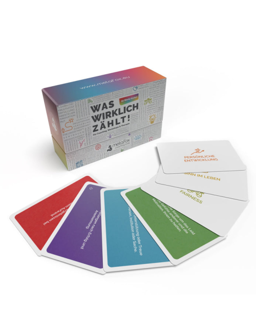 Die „Was wirklich zählt!“ Wertekarten helfen zu klären, was dir, deinen Klienten und Teilnehmern wichtig ist. Sich seiner Werte bewusst zu sein, hilft zu verstehen, was unser Verhalten antreibt und motiviert – und kann uns eine andere Perspektive eröffnen unser Leben verändern. Auch ein besseres Verständnis der Werte andere nützt uns: Wir werden zu besseren Freunden, effektiven Führungskräften und liebevolleren Partnern und Familienmitgliedern.