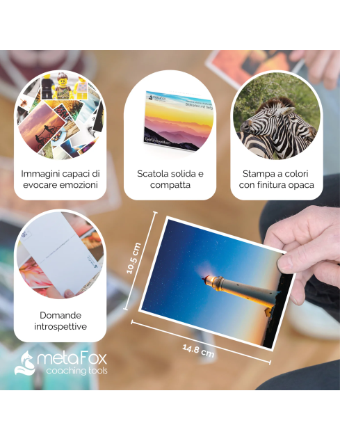 Les images profondes metaFox combinent 52 cartes illustrées évocatrices et de puissantes questions de coaching dans un ensemble de cartes postales pour adultes. Les images profondes « Le monde des émotions » vous guident dans un voyage de découverte de soi en entrant profondément en contact avec vos émotions et votre expérience intérieure.