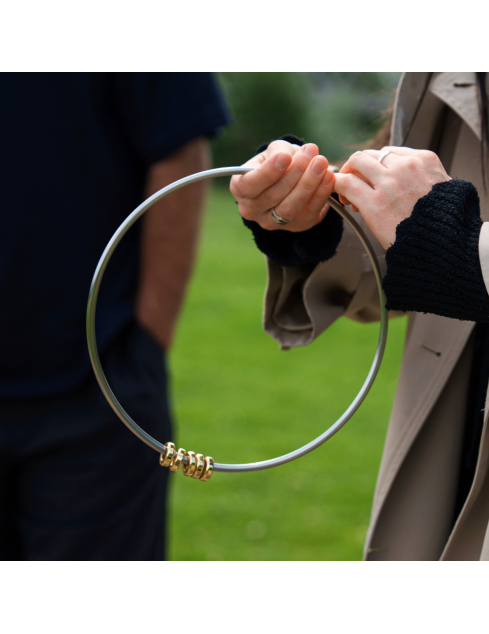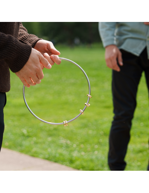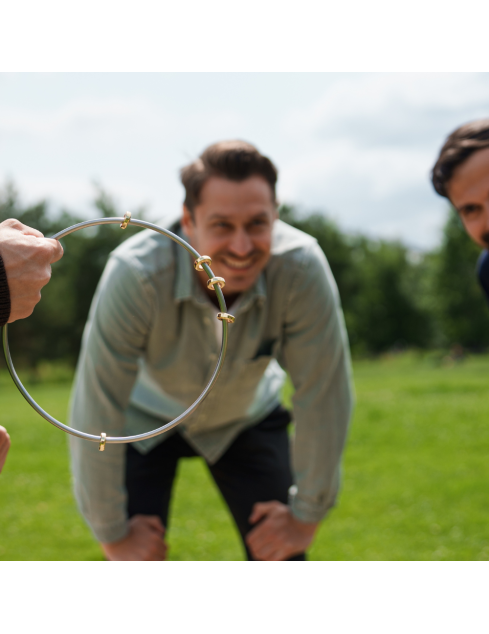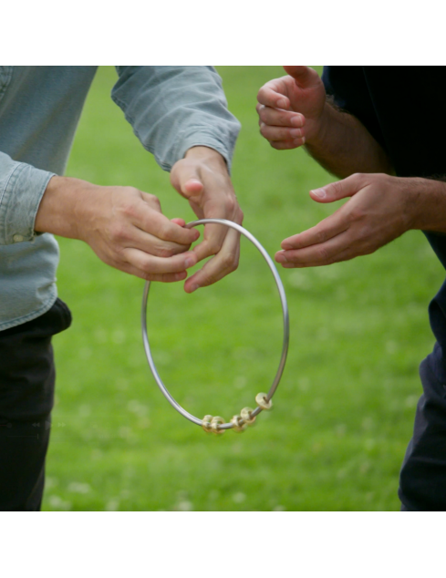 Le Teamring est un outil étonnamment simple mais stimulant pour créer de véritables moments de groupe. Un grand anneau avec cinq anneaux dorés – c'est tout ce qu'il faut pour rendre tangibles la concentration, la coordination et la coopération. Ceux qui veulent faire tourner tous les anneaux en même temps s'aperçoivent rapidement qu'il faut de la technique, de la patience et le bon rythme. C'est justement ce qui rend cet outil si attrayant : difficile au début, puis soudainement fluide. Idéal pour briser la glace, pour activer ou pour mettre en relation des groupes de manière ludique.