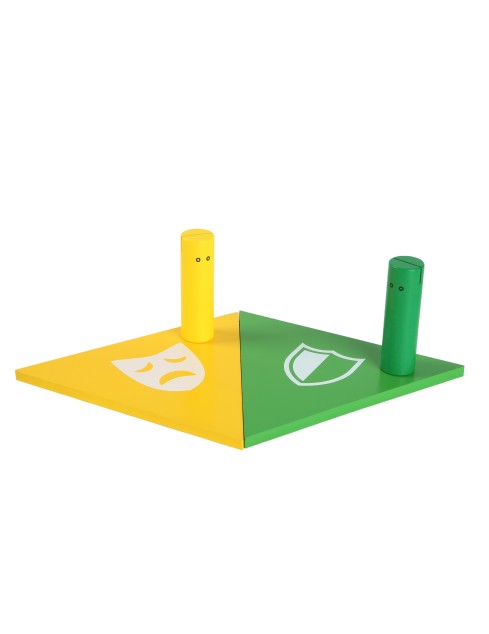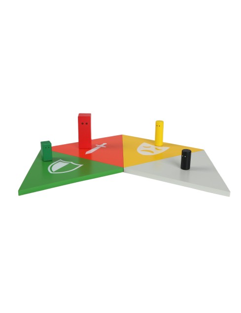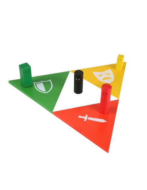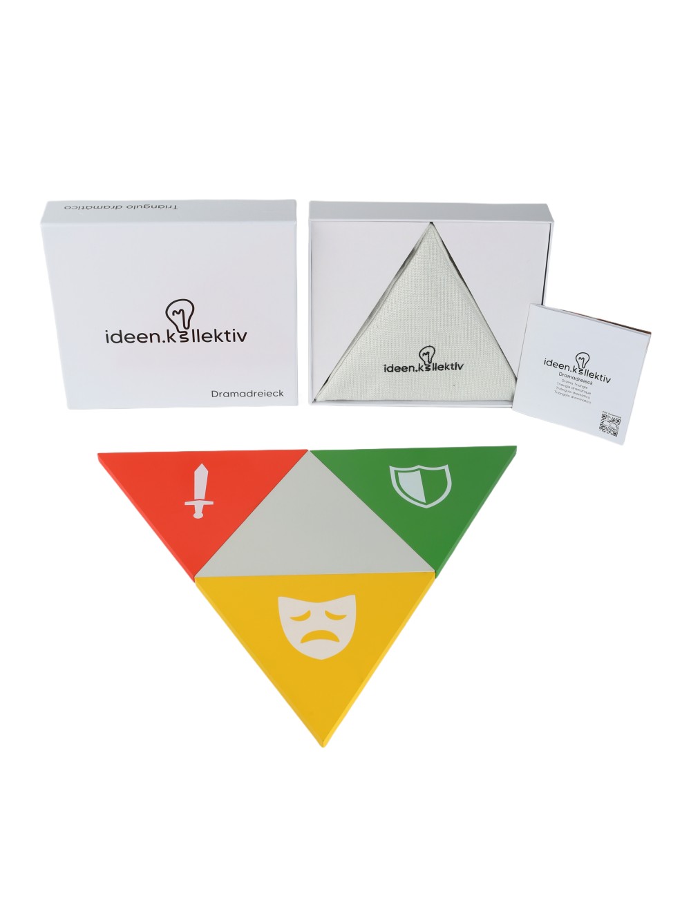 Le triangle dramatique permet de clarifier et de rendre tangibles les rôles et les dynamiques conflictuelles. Le kit se compose de quatre triangles en bois colorés qui s'assemblent pour former un grand triangle. Au centre se trouve le triangle neutre, qui ne représente ni la victime, ni le sauveur, ni le persécuteur, mais symbolise une attitude consciente et observatrice. Cela permet de visualiser les trois rôles classiques selon Karpman et de mieux les analyser. Que ce soit dans le coaching, en équipe ou en psychothérapie, le triangle dramatique favorise une communication claire et un changement durable.