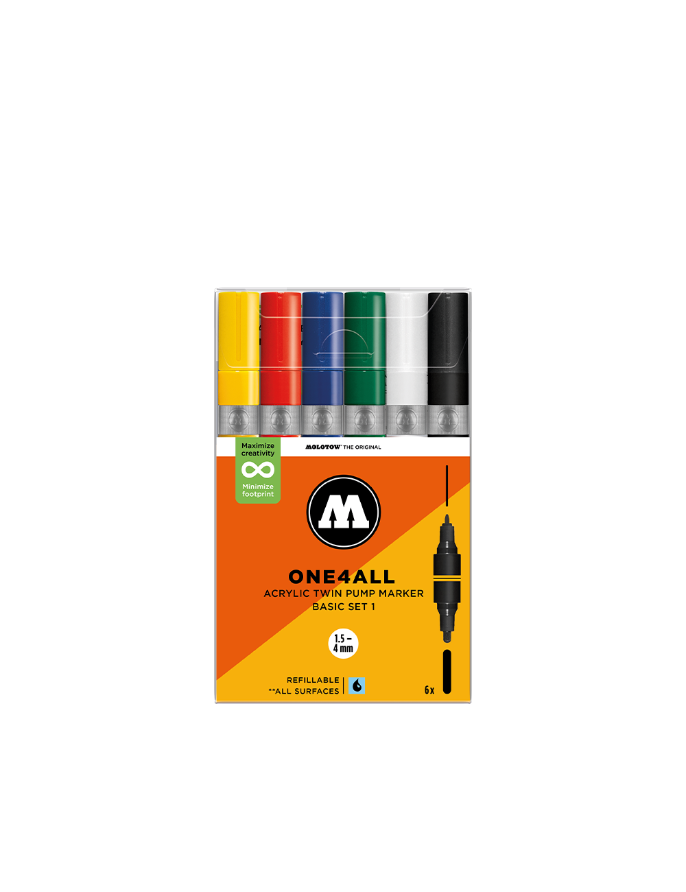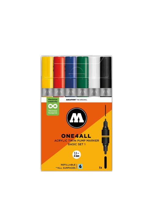 Pour les tracés larges et les grandes calligraphies, la peinture One4All est disponible dans des feutres acrylique pré-remplis de 4-8mm ! Découvrez ces 6 couleurs intenses et laissez vos envies créatives mener la danse !