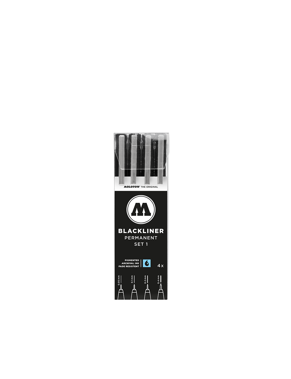 Le MOLOTOW™ Blackliner est le premier produit commun avec Schneider Schreibgeräte GmbH. Pour faire des croquis, pour l'école, pour les outlines ou comme simple fineliner : les Blackliner Made in Germany ont une encre indélébile à base d'eau et sont en plus résistants à l'eau et aux produits chimiques. Les pointes robustes serties de métal de 0,05 mm à 1,0 mm, Chisel et Round garantissent des lignes fines et précises et sont donc idéales pour les outlines. Grâce à la fonction "Cap off", les marqueurs sont protégés du dessèchement pendant 90 à 180 minutes*, même sans capuchon. Les Blackliners sont de haute qualité et ont une surface mate et maniable.